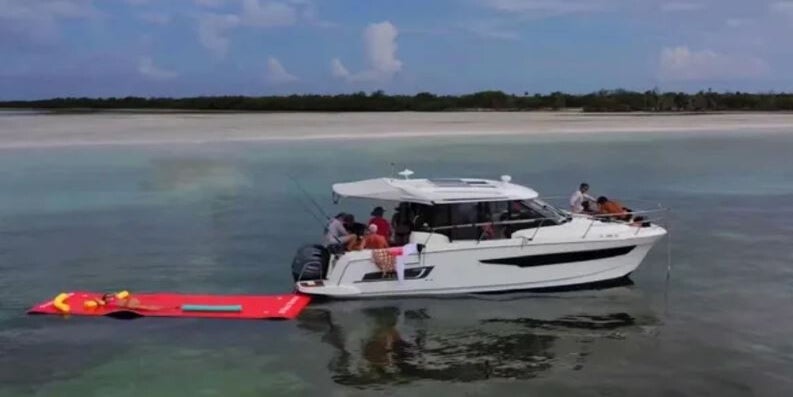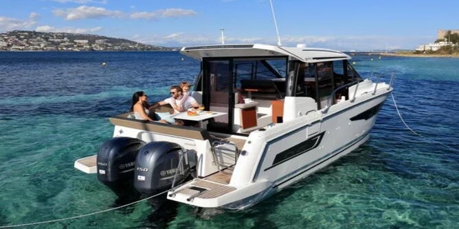 A luxurious motor yacht known for its sleek, low-profile design and spacious interior. It features a large hydraulic swim platform, perfect for water sports and snorkeling, and a fully enclosed, light-filled sunroom with retractable glass roofs.