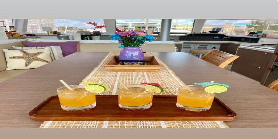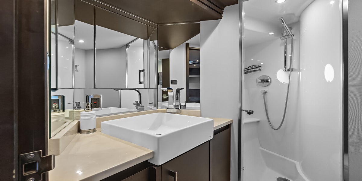 3 staterooms, including a full-beam master suite with his-and-hers heads, provide comfortable living spaces. Guest rooms offer one queen ensuite stateroom and a double twin ensuite stateroom, plus additional below deck crew quarters.