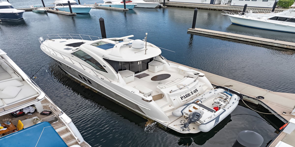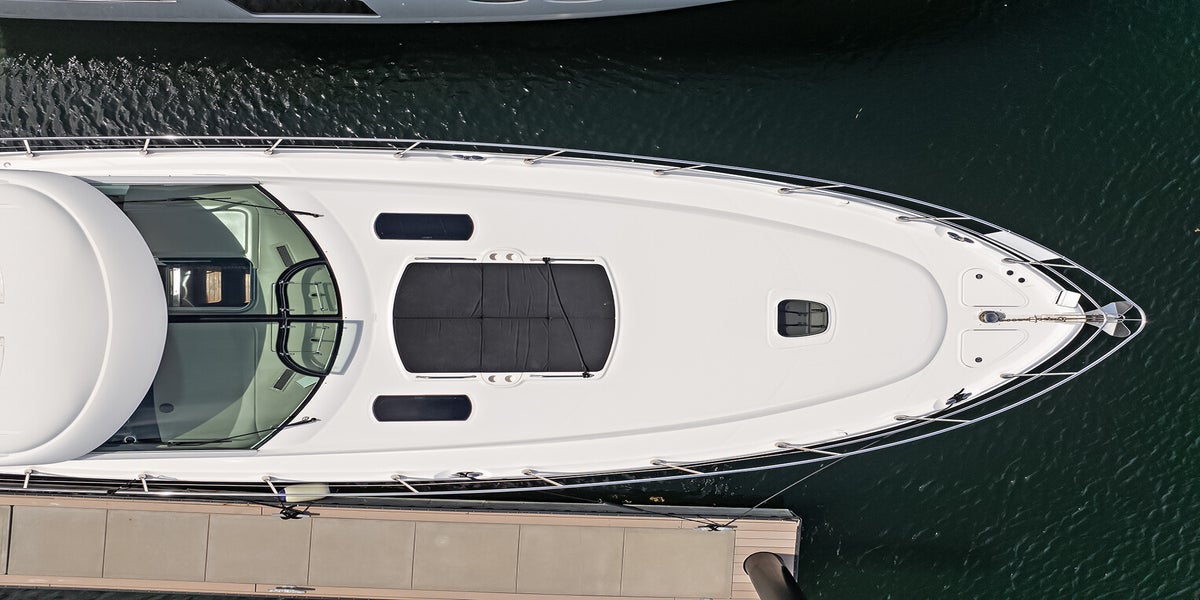 The 60 Sundancer is known for its unique three-stateroom layout, providing comfortable accommodations for guests. We offer two queen staterooms and a third with double twin beds.